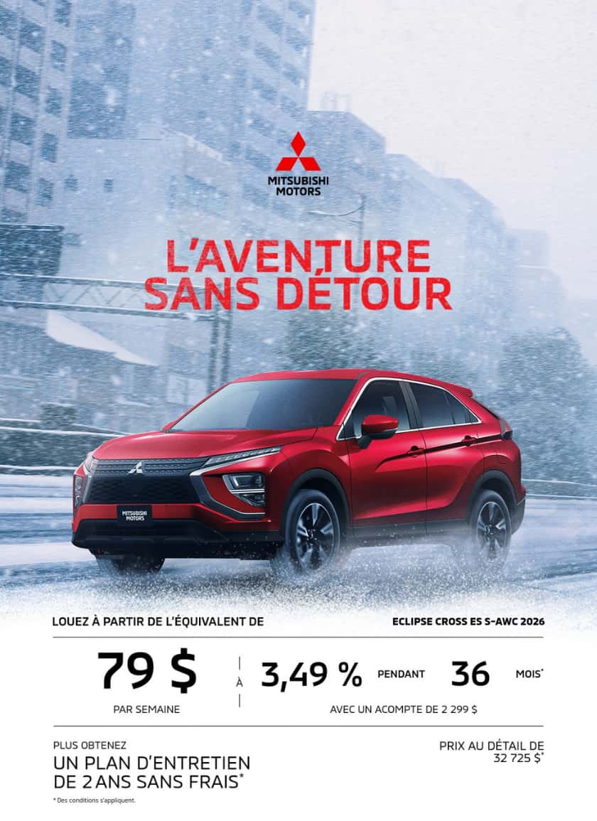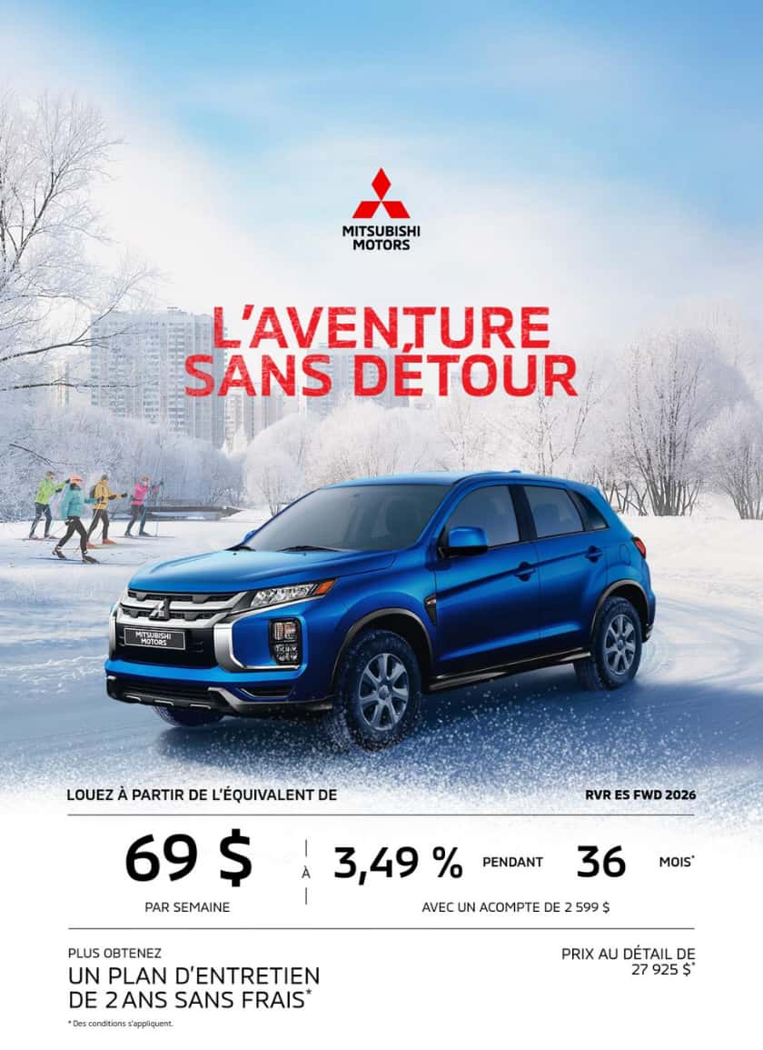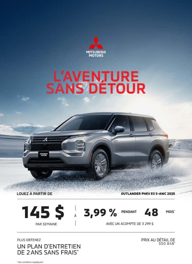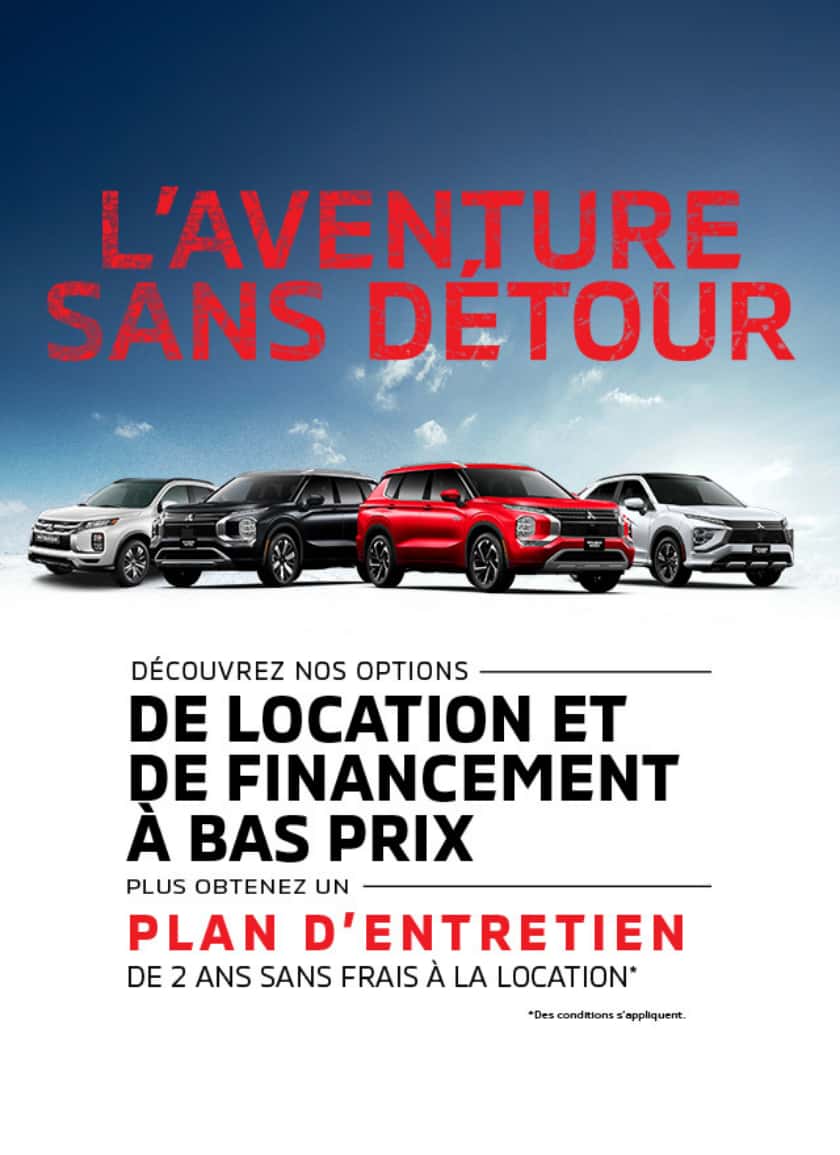 Merci de visiter notre site web. Nous vous invitons à nous contacter et prendre un rendez-vous pour de plus amples renseignements sur nos services. Que ce soit pour l’achat ou la location d’un véhicule neuf, d’un véhicule d’occasion, pour l’entretien de votre véhicule, pour commander des pièces ou des accessoires pour votre Mitsubishi, pour notre centre de carrosserie ou l’évaluation de la valeur d’échange de votre véhicule, soyez assurés de notre plein dévouement envers vos attentes.