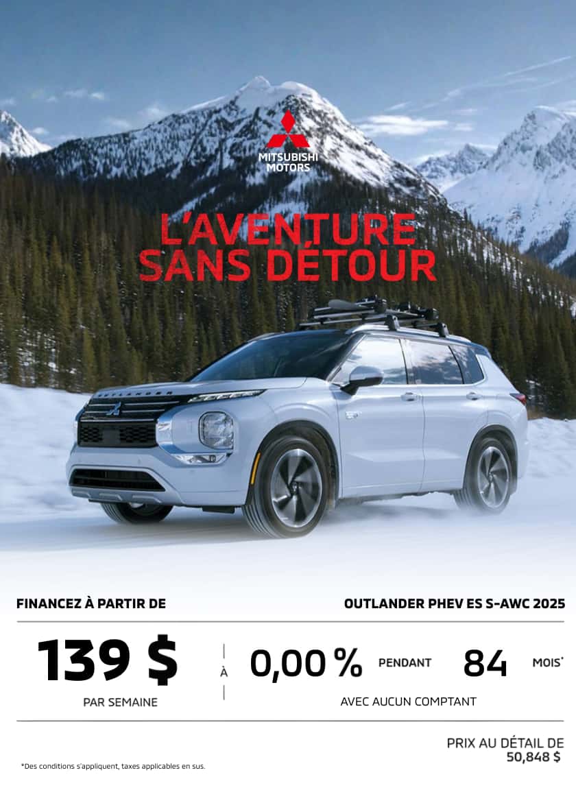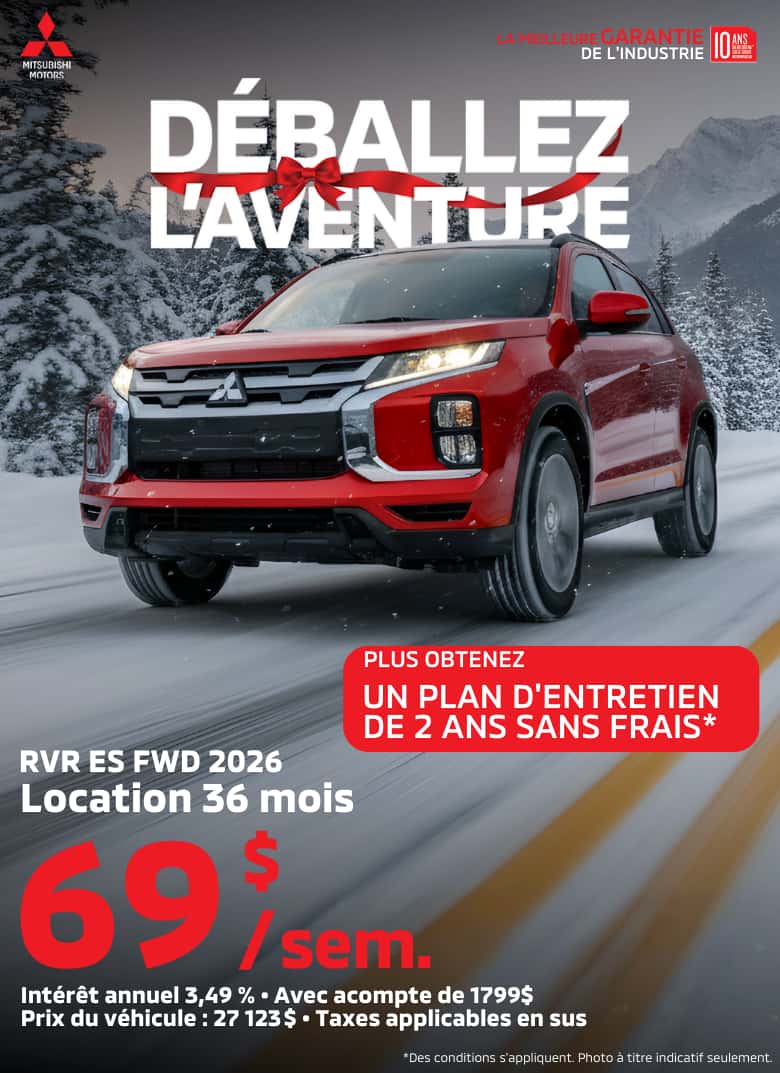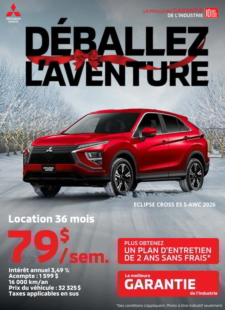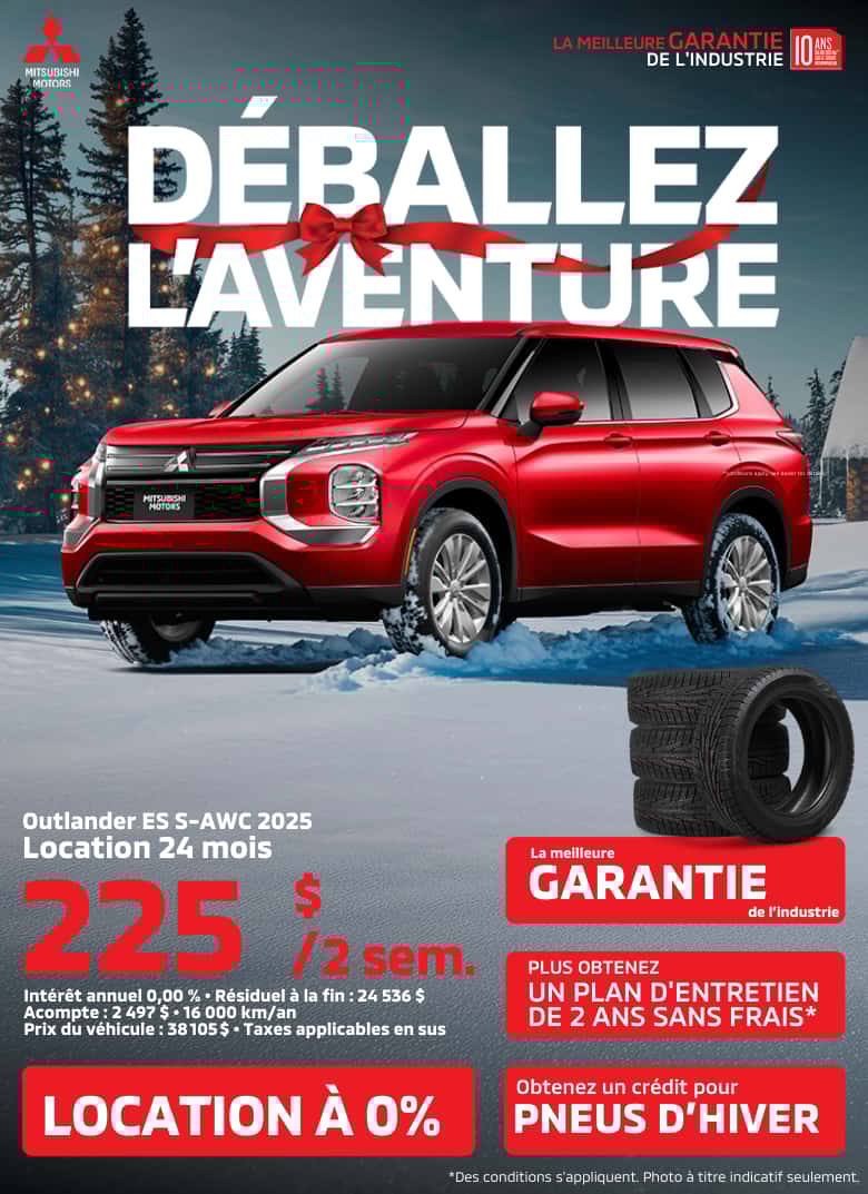 Merci de visiter notre site web. Nous vous invitons à nous contacter et prendre un rendez-vous pour de plus amples renseignements sur nos services. Que ce soit pour l’achat ou la location d’un véhicule neuf, d’un véhicule d’occasion, pour l’entretien de votre véhicule, pour commander des pièces ou des accessoires pour votre Mitsubishi, pour notre centre de carrosserie ou l’évaluation de la valeur d’échange de votre véhicule, soyez assurés de notre plein dévouement envers vos attentes.