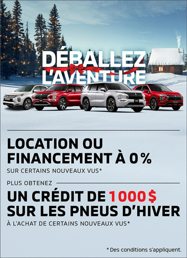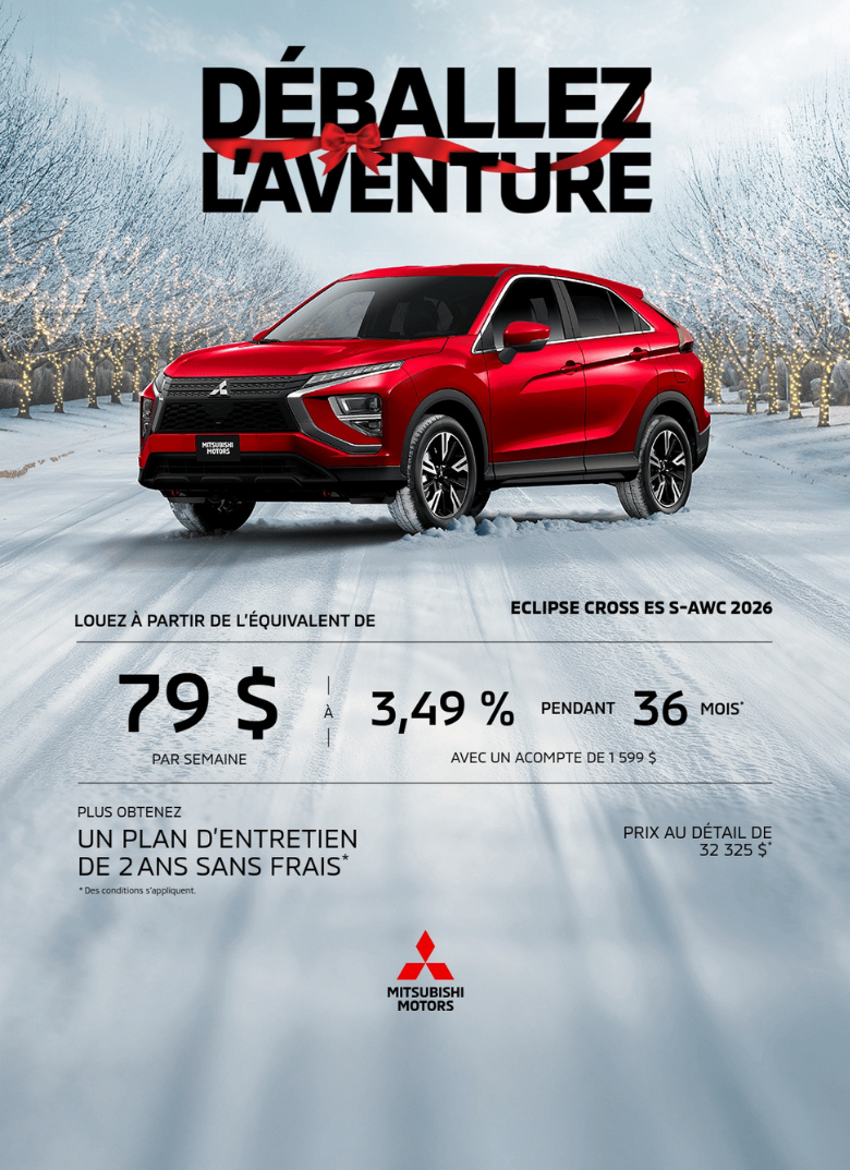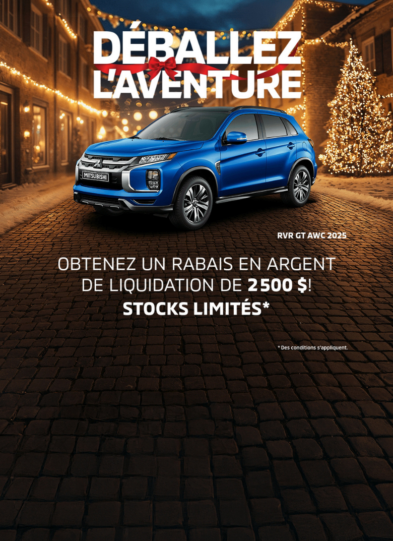Merci de visiter notre site web. Nous vous invitons à nous contacter et prendre un rendez-vous pour de plus amples renseignements sur nos services. Que ce soit pour l’achat ou la location d’un véhicule neuf, d’un véhicule d’occasion, pour l’entretien de votre véhicule, pour commander des pièces ou des accessoires pour votre Mitsubishi, pour notre centre de carrosserie ou l’évaluation de la valeur d’échange de votre véhicule, soyez assurés de notre plein dévouement envers vos attentes.
